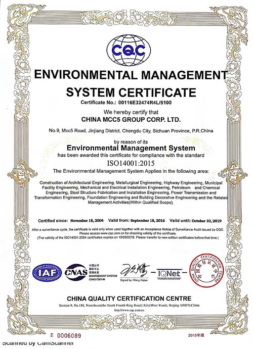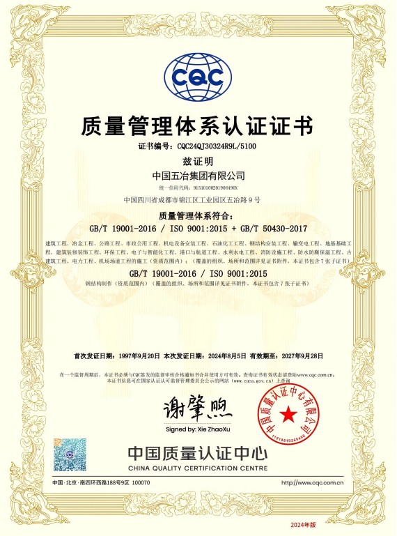 中國五冶集團(tuán)有限公司(以下簡稱中國五冶集團(tuán)),1997年通過ISO9000質(zhì)量體系認(rèn)證。2004年,中國五冶集團(tuán)按照ISO9001、ISO14001、OHSAS18001國際標(biāo)準(zhǔn)要求,建立質(zhì)量環(huán)境職業(yè)健康安全整合型管理體系并通過三標(biāo)一體認(rèn)證。2011年,中國五冶集團(tuán)按照GB/T50430-2007《工程建設(shè)施工企業(yè)質(zhì)量管理規(guī)范》要求,建立并通過質(zhì)量環(huán)境職業(yè)健康質(zhì)量管理規(guī)范的三標(biāo)一規(guī)范體系認(rèn)證,至今保持三標(biāo)一規(guī)范管理體系連續(xù)、平穩(wěn)和協(xié)調(diào)運(yùn)行。