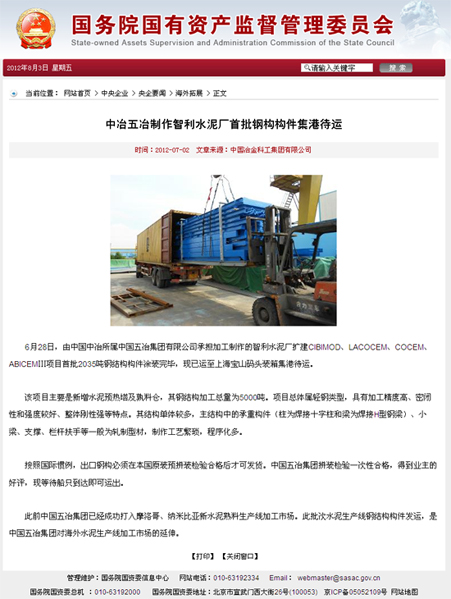 國資委報道:中冶五冶制作智利水泥廠首批鋼構(gòu)構(gòu)件集港待運(yùn)