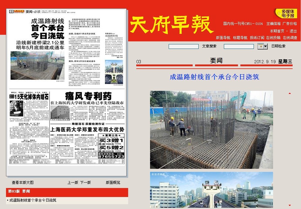 天府早報(bào)報(bào)道:成溫路射線首個(gè)承臺(tái)今日澆筑