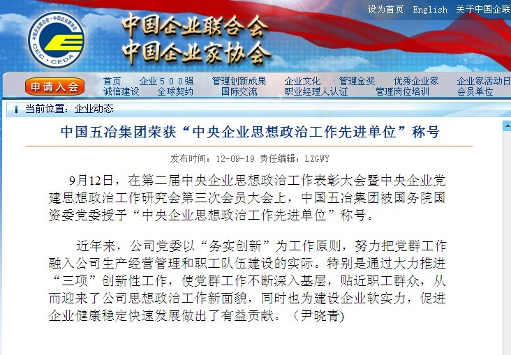 中國(guó)企業(yè)聯(lián)合網(wǎng)報(bào)道:中國(guó)五冶集團(tuán)榮獲“中央企業(yè)思想政治工作先進(jìn)單位”稱號(hào)