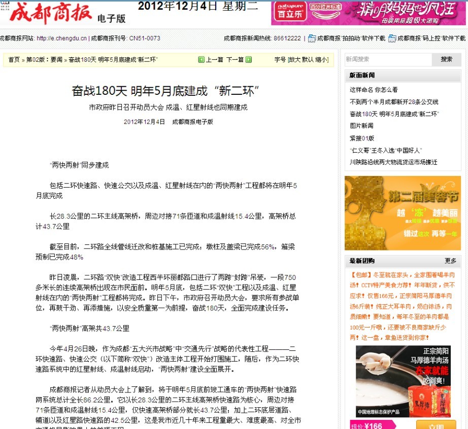 成都商報報道:奮戰(zhàn)180天 明年5月底建成“新二環(huán)”