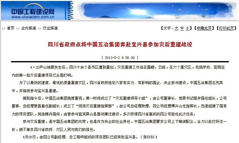 中國工程建設(shè)網(wǎng)報(bào)道:四川省政府點(diǎn)將中國五冶集團(tuán)奔赴寶興縣參加災(zāi)后重建戰(zhàn)役