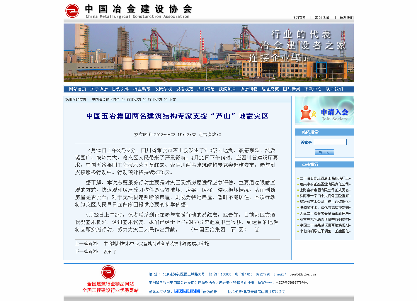 下一篇:國資委報(bào)道:中冶五冶兩名建筑結(jié)構(gòu)專家支援蘆山地震災(zāi)區(qū)