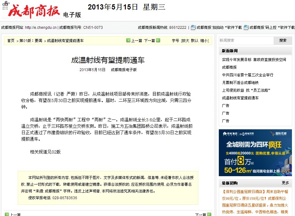 成都商報(bào)報(bào)道:成溫射線有望提前通車