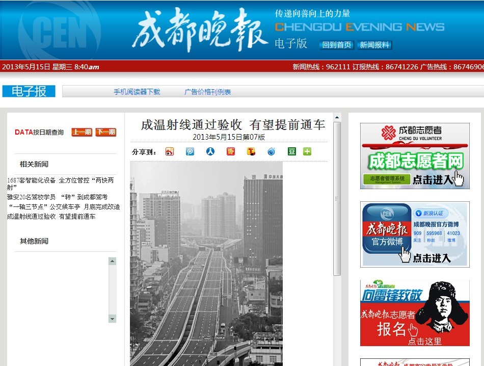 昨日,成都晚報記者從中國五冶成溫射線項目部獲悉,成溫射線目前已全面完工,并通過了市建委關于質量、通車能力等項目的行政驗收,有望月底前實現(xiàn)提前通車。