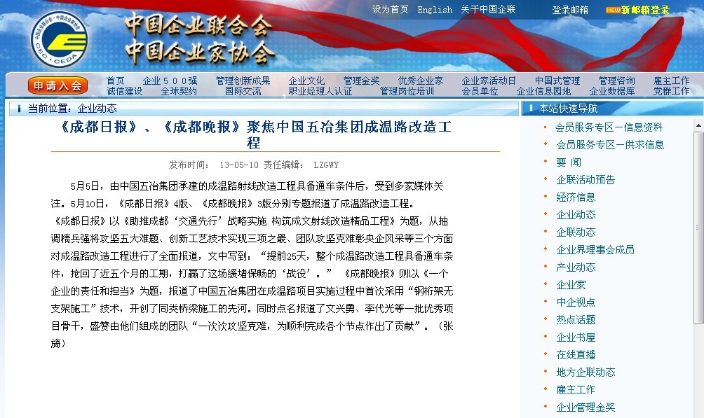 中國企業(yè)聯(lián)合會(huì)網(wǎng)報(bào)道:《成都日報(bào)》、《成都晚報(bào)》聚焦中國五冶集團(tuán)成溫路改...