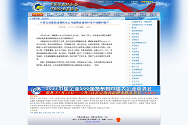 中國企業(yè)聯(lián)合會報道:中國五冶集團成都機電公司威鋼高速線材生產(chǎn)線順利投產(chǎn)