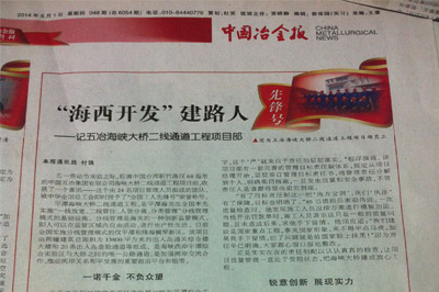 5月1日,《中國冶金報(bào)》第八版發(fā)表題為《“海西開發(fā)”建路人——記五冶海峽大橋二線通道工程項(xiàng)目部》的報(bào)道,報(bào)道了中國五冶集團(tuán)海峽大橋二線通道工程項(xiàng)目部,榮獲中華全國總工會(huì)授予的“全國工人先鋒號(hào)”榮譽(yù)稱號(hào),在整個(gè)工程中的勇于拼搏、善于創(chuàng)新精神。