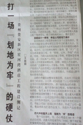 4月2日,建筑時(shí)報(bào)第3207期第六版以《打一場(chǎng)“劃地為牢”的硬仗》為題,從“頂層設(shè)計(jì)一根線,串起公司層層萬(wàn)條針”、“四大件標(biāo)配齊上陣,劃地為‘牢’創(chuàng)奇跡”、“在速度與轉(zhuǎn)型中演繹冰火之歌”三個(gè)層面對(duì)中國(guó)五冶承建的貴州貴安新區(qū)星河灣酒店的建設(shè)過(guò)程進(jìn)行了如實(shí)報(bào)道。