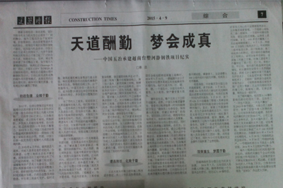 4月9日,《建筑時報》第3209期第七版頭條以《天道酬勤?夢會成真——中國五冶承建越南臺塑河靜鋼鐵項(xiàng)目紀(jì)實(shí)》為題,從“初戰(zhàn)告捷,業(yè)精于勤;遭遇轉(zhuǎn)折,化險于勤;涅槃重生,?夢圓于勤”三個方面,刊文報道了中國五冶集團(tuán)海外項(xiàng)目管理中較先進(jìn)和較成熟的管理模式,對中國五冶為確保項(xiàng)目履約質(zhì)量而配備的高效實(shí)用的應(yīng)急處理機(jī)制進(jìn)行了詳細(xì)梳理。