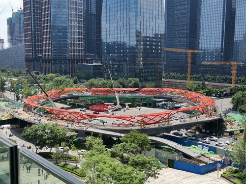 該項目位于成都市高新區(qū)益州大道路口,屬交子金融大街形象提升工程中的重點項目。中國五冶集團主要承建該項目的鋼結(jié)構(gòu)制安部分,屬異形空間結(jié)構(gòu),是整個施工環(huán)節(jié)技術含量最高,難度最大的部分。交子之環(huán)內(nèi)直徑90米,外直徑110米,主要包括結(jié)構(gòu)環(huán)、交通環(huán)和風雨環(huán)廊三部分,工程量約3500噸。