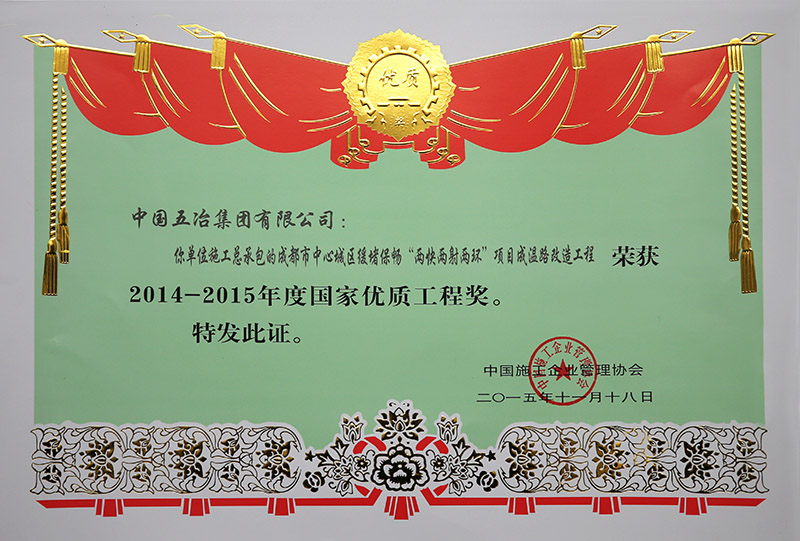 ????2015年12月18日,中國(guó)五冶集團(tuán)成溫路改造工程榮獲2014-2015年度國(guó)家優(yōu)質(zhì)工程銀獎(jiǎng)。