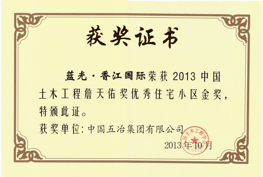 ????2013年10月,中國五冶集團(tuán)有限公司藍(lán)光·香江國際項(xiàng)目榮獲2013年度中國土木工程詹天佑獎(jiǎng)優(yōu)秀住宅小區(qū)金獎(jiǎng)。