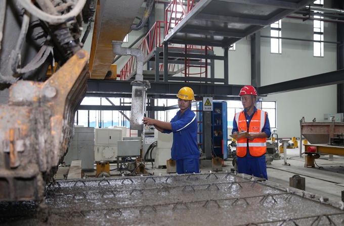 16名來自裝配式生產(chǎn)線的參賽男女員工分成四個(gè)小隊(duì),在由技術(shù)專家擔(dān)任“裁判”的賽場上開展兩個(gè)項(xiàng)目的技能比拼。一聲令下,參賽隊(duì)伍首先來到裝配式構(gòu)件模臺上“拼手速”,分頭進(jìn)行模臺清理、劃線、鋼架測量拼裝和預(yù)埋組件組合固定等系列作業(yè);隨后,隊(duì)伍們陸續(xù)來到數(shù)控機(jī)床面板前“拼手藝”,按照圖紙上的設(shè)計(jì)參數(shù),進(jìn)行生產(chǎn)線上的混凝土裝配板下料和振搗作業(yè),比拼哪支隊(duì)伍能又快又好地完成“較量”。