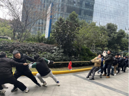 本次活動設置了拔河比賽和游園活動兩大版塊。隨著開始口令響起,拔河比賽在熱烈歡快的氣氛中拉開帷幕,機關職工組成兩隊分列繩索兩頭,在熱火朝天的加油聲中齊心協(xié)力賽出了激情、賽出了水平。隨后的游園活動,“一錘定音”用響亮的鑼鼓敲響新年的先聲,寄托了開年紅的寓意;“知識問答”環(huán)節(jié)將主題教育理論知識和公司三屆二次“兩代會”暨2023年度工作會議精神,通過有獎問答的形式寓教于樂,大家積極踴躍搶答,不斷將現(xiàn)場氣氛推向高潮;“海底撈月”則通過用竹棍運送乒乓球的競技小游戲祝福大家新年撈到福氣、幸運滿滿。