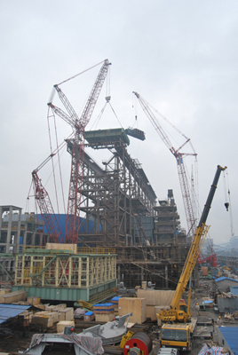 3月16日上午,由中國(guó)五冶集團(tuán)上海有限機(jī)電公司承建的寶鋼焦?fàn)t干熄焦項(xiàng)目提升機(jī)臺(tái)架吊裝完成。