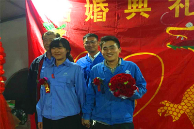 5月28日,青島即墨項(xiàng)目部建筑一線的陳曉東與妻子李海燕因工期緊、任務(wù)重,沒(méi)有時(shí)間回老家舉辦婚禮,同事們?cè)诠さ貫樗麄兣e辦了這場(chǎng)特別婚禮,項(xiàng)目部還為新人布置了婚房,雖然是工地上的活動(dòng)板房,但婚房在大紅喜字、彩帶的裝扮下,顯得非常溫馨喜慶。