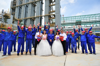 湛鋼工地領(lǐng)導(dǎo)得知這一情況后,決定就在湛鋼工地上為他們舉行一次別樣的婚禮。伴隨著湛鋼煉焦項(xiàng)目機(jī)器設(shè)備的轟鳴聲,湛鋼五冶分指揮部黨工委書記薛志群向兩位新人獻(xiàn)上了鮮花,并送上了深深的祝福,薛書記說道:“你們?yōu)檎夸摴さ氐慕ㄔO(shè)做出了貢獻(xiàn),辛苦了。這次的婚禮有著特殊的意義,希望你們幸福美滿,和和睦睦,白頭到老。也希望你們能早生貴子,像咱們湛鋼工地一樣,早日結(jié)出豐碩的果實(shí)?!彪S后,在現(xiàn)場(chǎng)20多位工友的見證祝福下,兩對(duì)新人相互擁吻,在大家的歡呼和祝福聲中新人流下了幸福和激動(dòng)的淚水。